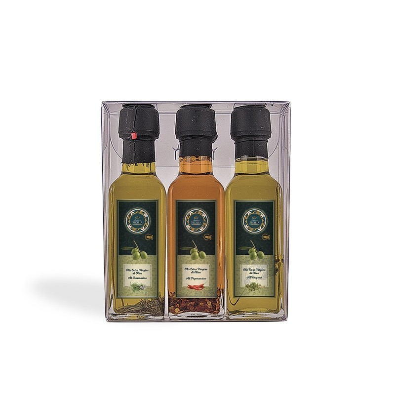 Confezione regalo tris Olio aromatizzato Antica Sicilia composta da: olio aromatizzato al rosmarino cl. 10, olio aromatizzato al peperoncino cl. 10, olio aromatizzato all'origano cl. 10.
